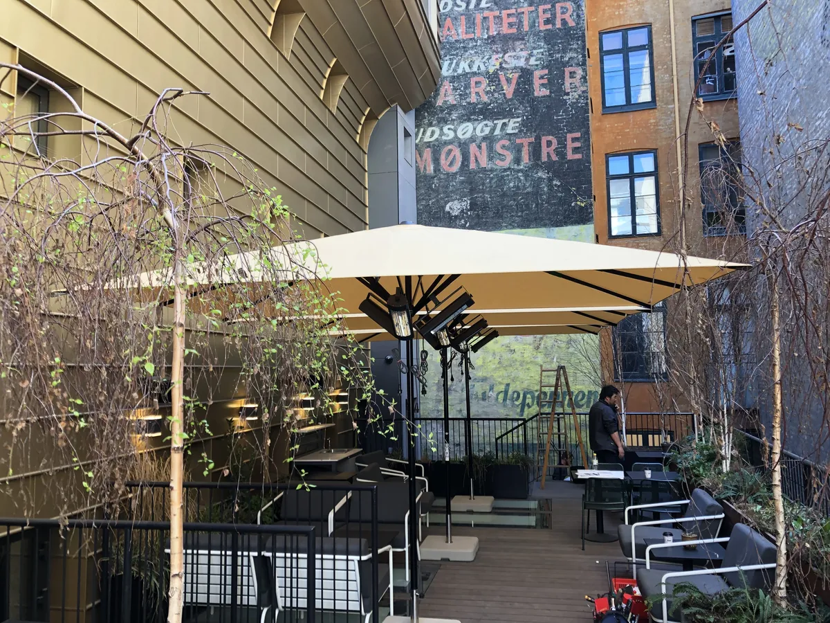 En stor og flot markedsparasol fra Caravita er velegnet til hoteller og restauranter, da deres kvadratiske design dækker et stort område og giver en elegant solafskærmning. Hvis du ønsker at reklamere stilfuldt kan parasollen produceres med dit logo tryk, så du på en meget neutral måde kan reklamere med din restaurant, Café eller lign. Derudover tager markedsparasollen sig godt ud på terrasser/områder, hvor den giver god skygge for gæster, som ønsker at sidde ude, men ikke i direkte sol. Parasollen beskytter også mod duggen, som falder om aftenen og giver dermed mulighed, for at udelivet/udeserveringen forlænges.