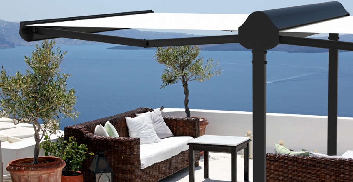 Cafe 400 er en kompakt kassette markise som kan monteres på 3 slags ben/fødder, fliser, beton og jord/græs.