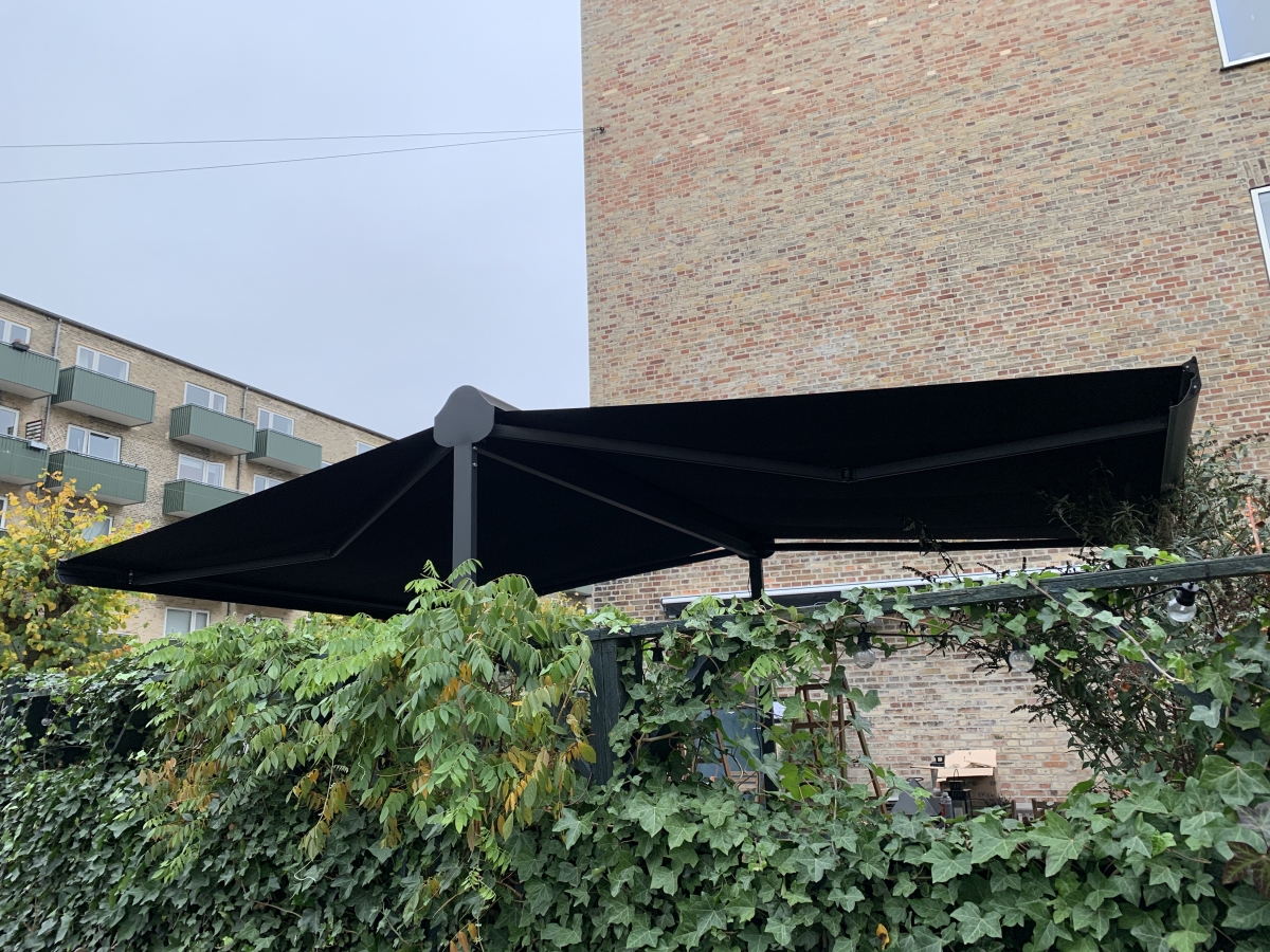 En perfekt løsning til store terrasser og restauranter/spisesteder med ude servering. Cafe 400 har en max bredde på 550 cm og et max udfald på 300 cm. Grundet funktionen som en dobbeltmarkise kan max udfaldet sammenlagt blive op til 600 cm Markisens stel leveres som standard i hvid pulverlakeret, men kan også leveres i andre RAL-farver.