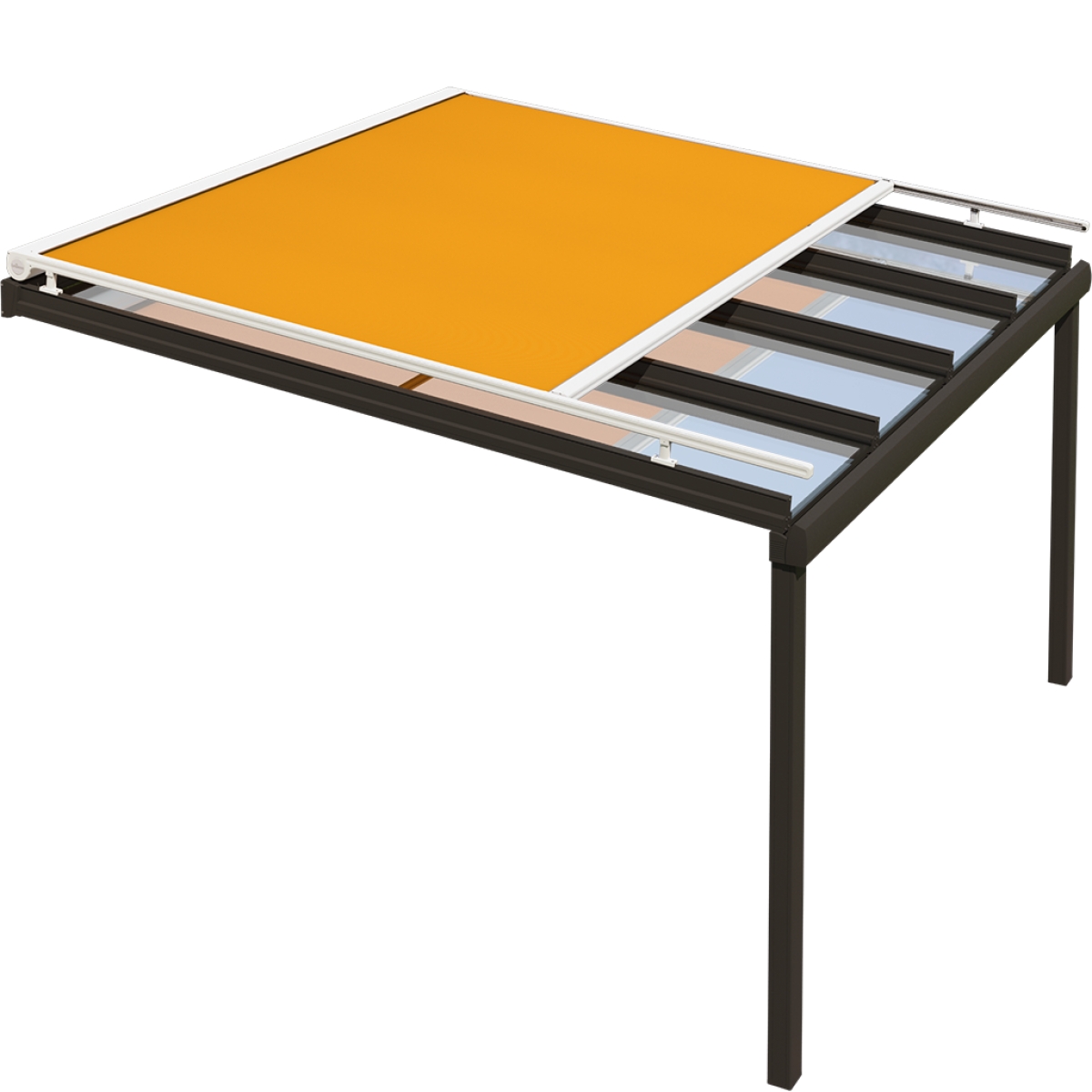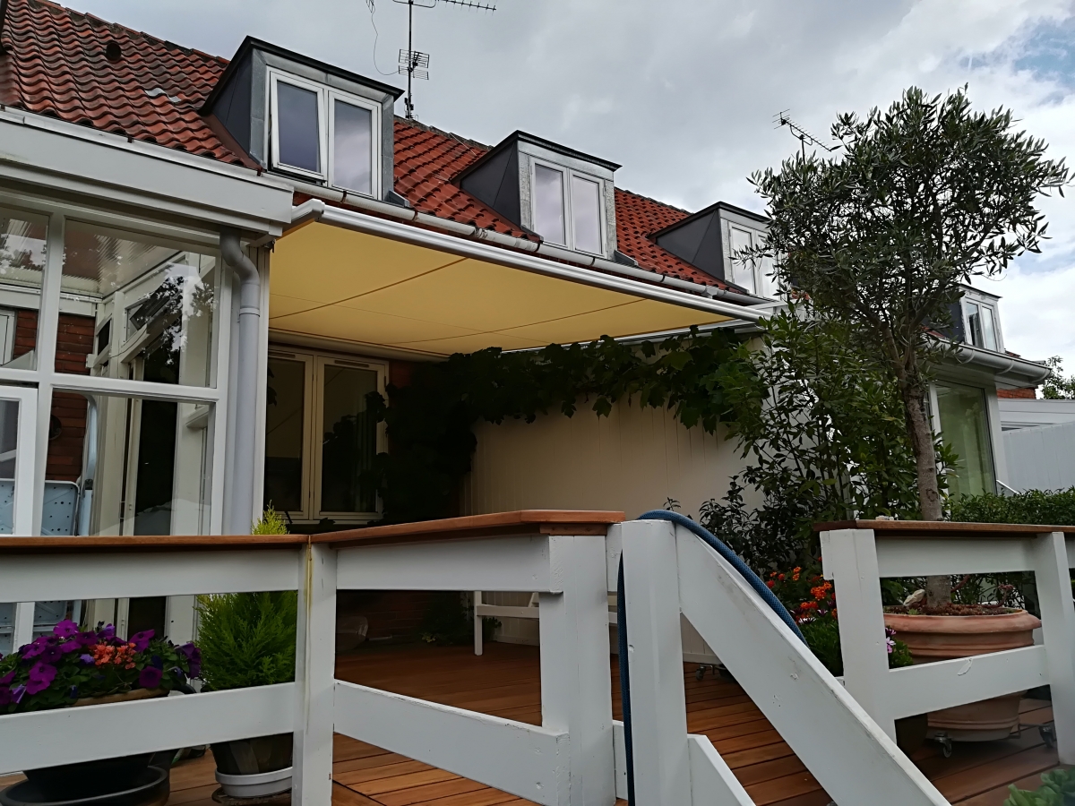 Cafe 500 er en skinnemarkise i tysk kvalitet som er specielt udviklet til montering på glasrammer eller mellem 2 bygninger og kan laves som 3 løsninger.