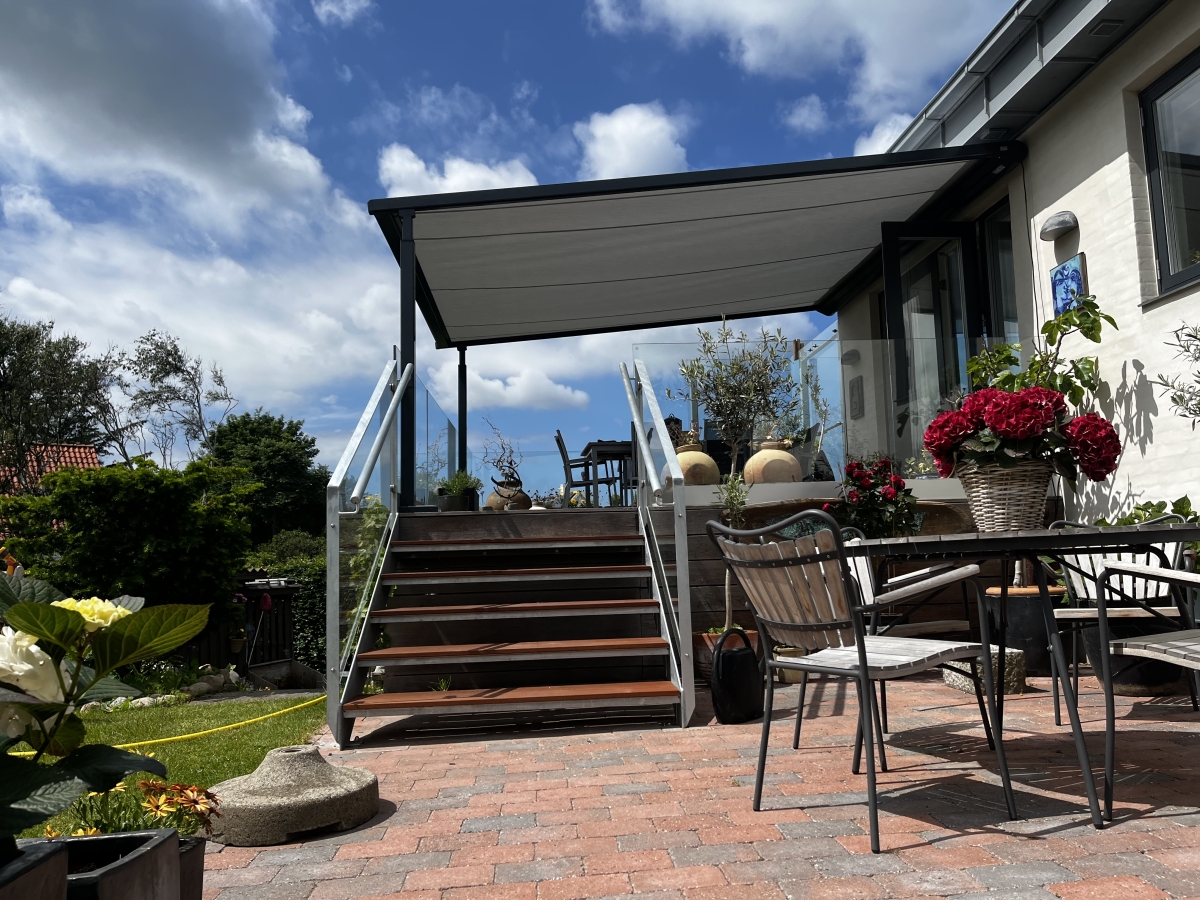 En ekstra lækker detalje er, at markisen kan produceres med Justerbar ben, sådan så man kan regulere højden på solafskærmningen – mod tillæg på 5000 kr. pr. ben.