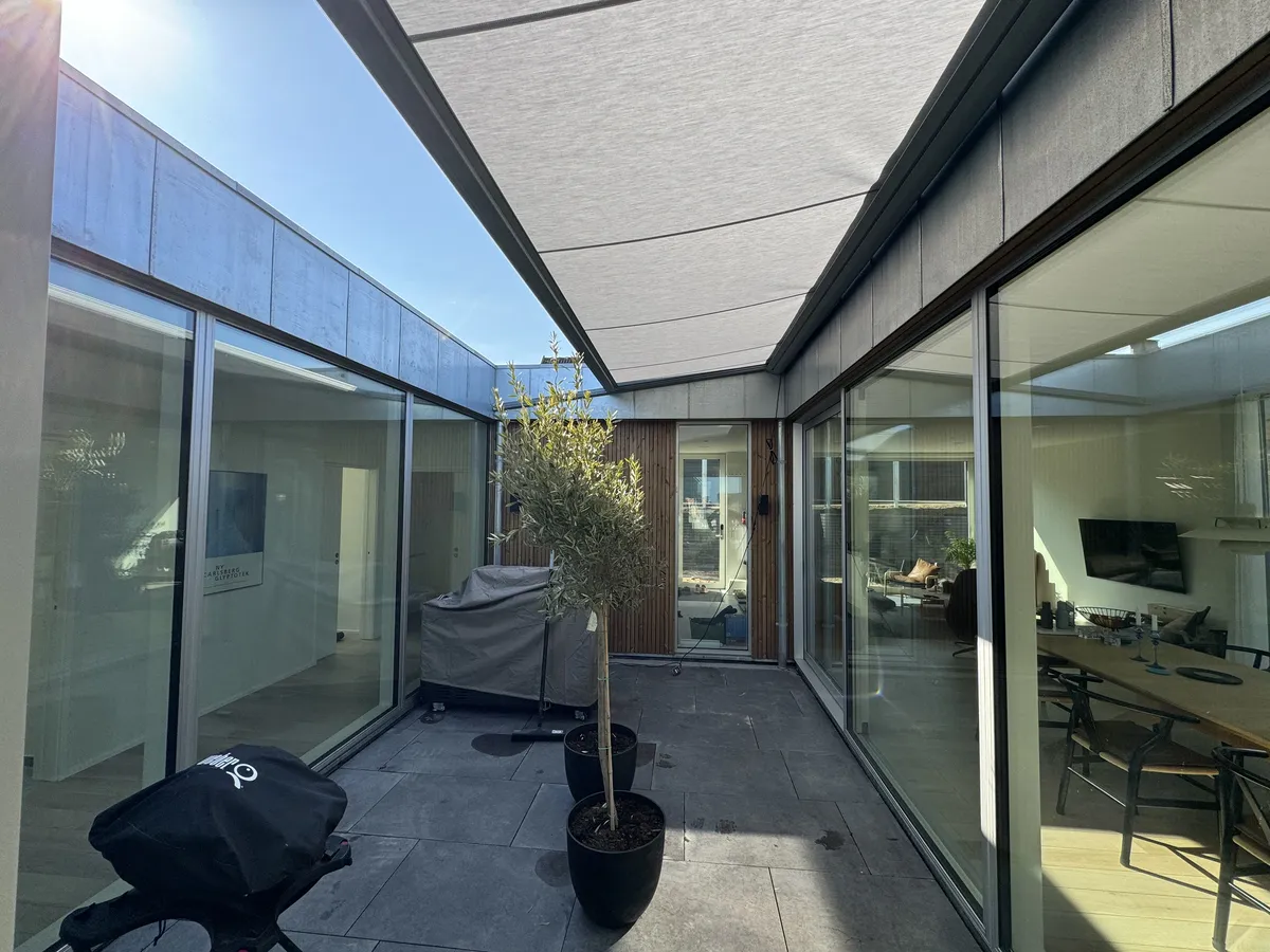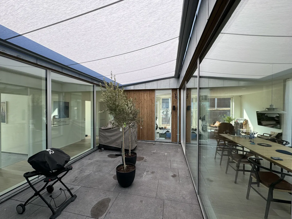 Mod tillæg kan denne Skinnemarkise med Zip system produceres med Rullegardin/nedfald i forbommen og kan som standard køre 150 cm ned og kan produceres med almindelig akryl/polyester dug eller mod ekstra tillæg i perforeret PVC dug soltis 92, som gør dig i stand til at se igennem stoffet. Nedfaldet kan du vælge at styre enten med rullestang eller med Somfy RTS solcelle motor med fjernbetjening. Løsningen med Rullegardin/nedfald er velegnet til vestvendte terrasser, hvor solen står lavt om aftenen eller til dig som ønsker at skabe privatliv på terrassen.